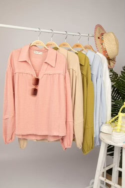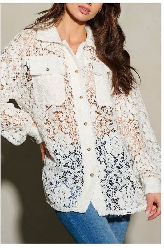 Long Sleeve Button up Pocket Crochet Blouse Top
