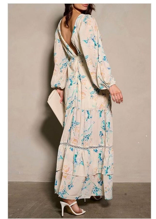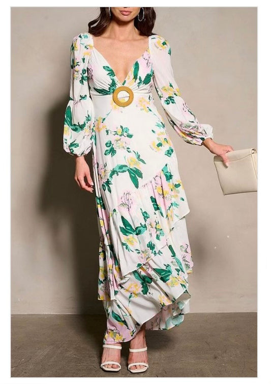 LONG SLEEVE SELF TIE MULTI PRINT BUTTON UP MIDI DRESS